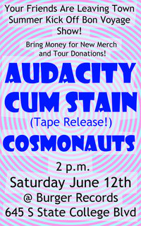 Event kicks off at 2 PM and features Audacity, Cum Stain, and Cosmonauts! Be there!!